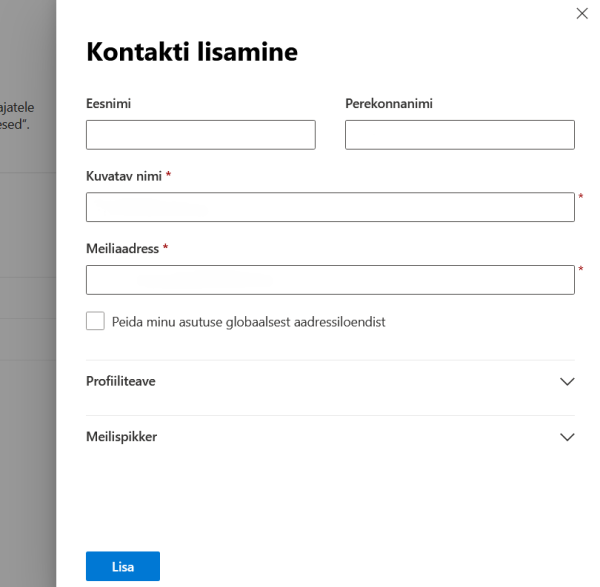 Tekita kontakt koos kõikide vajalike väljadega, nimi ja e-posti aadress.