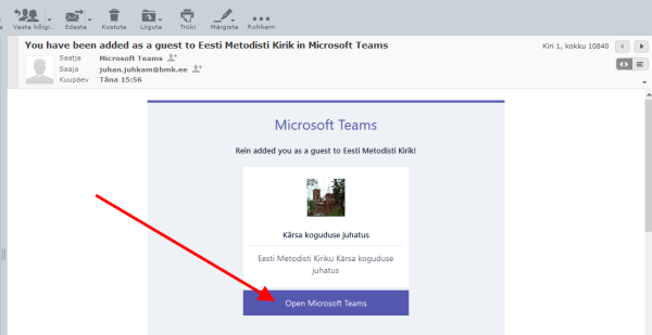 Kasutaja, kes on kutsutud Teams töörühma, saab kutsekirja, milles asuv link avab antud grupi Teams lehekülje.